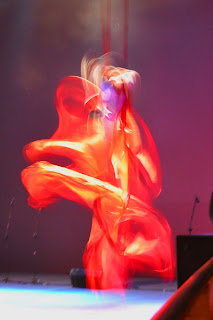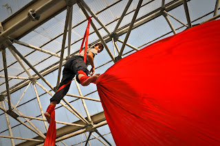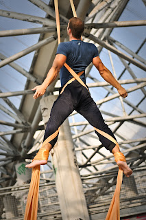 Io, Daniele e Marianna, accompagnati dal’ amico Angelo Rota come supporto e fotografo per l’occasione, entrando in teatro ci sentiamo dei veri “vip”. Camerini tutti nostri, dotati di specchi con classiche lampadine tonde a cornice e divanone su cui stravaccarsi nell’attesa del nostro turno. Il montaggio dei tessuti me lo sbrigo in un oretta, nonostante le problematiche date da una torre di scena alta “solo” 26 metri! L’ attesa sui divanoni si dimostra lunga: da scaletta saremmo dovuti salire in palcoscenico alle 11.25, con un lieve ritardo alle 12 è il nostro momento e svolgiamo la nostra coreografia che procede molto bene. Un paio di minuti sale Marianna da sola sul tessuto centrale, sulle note di una musica dolcissima danza e si muove leggera. Dopo il suo pezzo è il turno mio e di Daniele, che con buon sincronismo svolgiamo qualche figura e due cadute che strappano un po’ di applausi a un pubblico molto coinvolto e entusiasta. Le sensazioni che i tessuti ci regalano sono bellissime e, vista la lunghezza di questi e delle corde per tenerli fissati al graticcio, sono morbidissimi e molto molleggiati, cascare e dondolare è davvero piacevolissimo.
