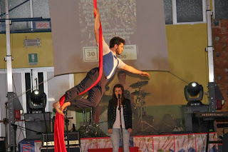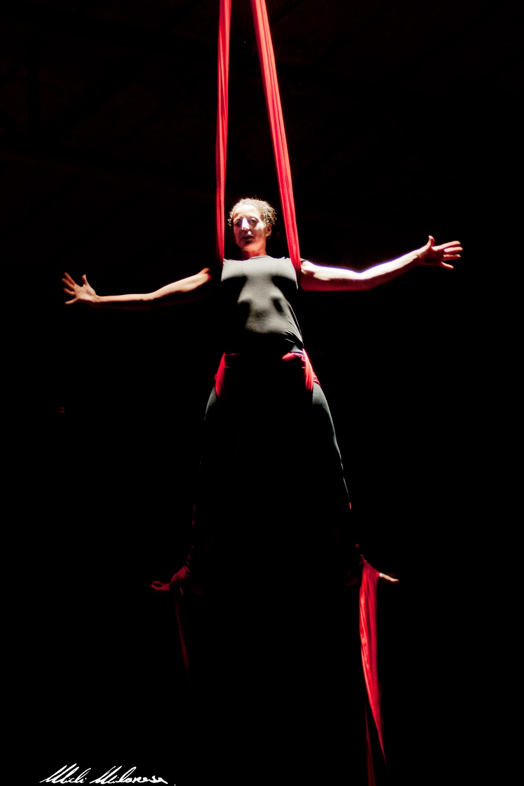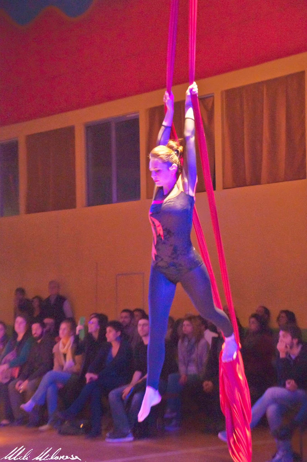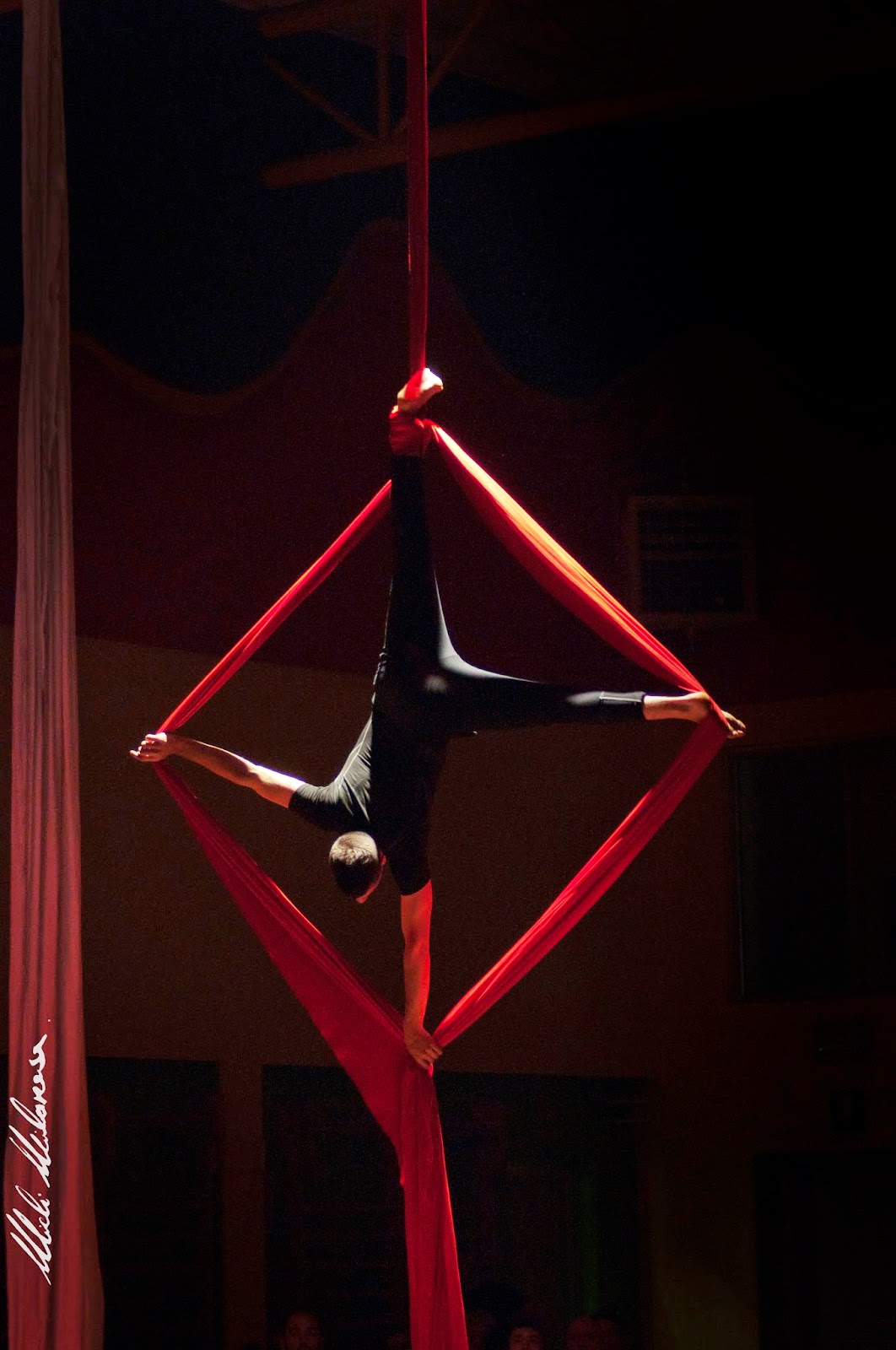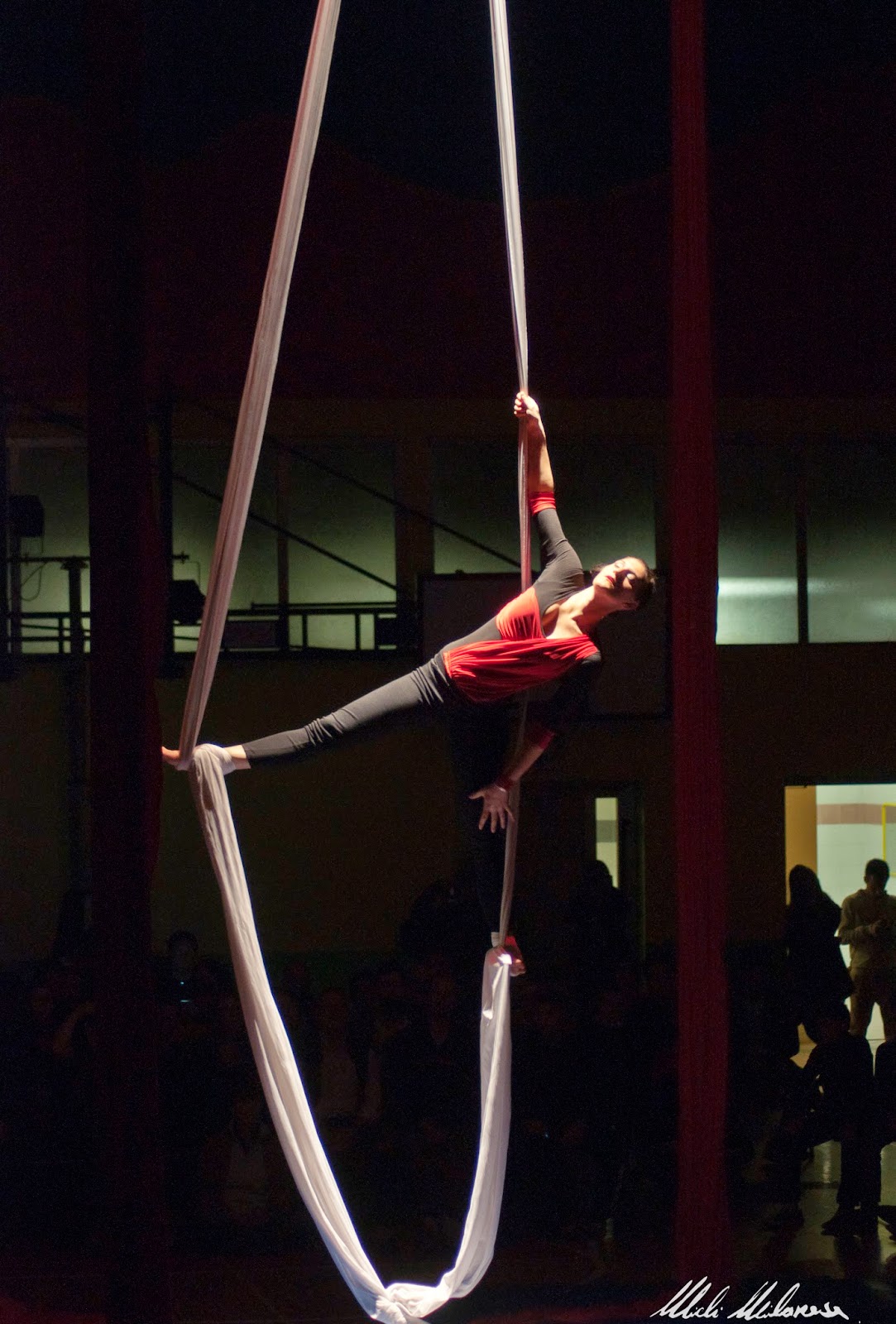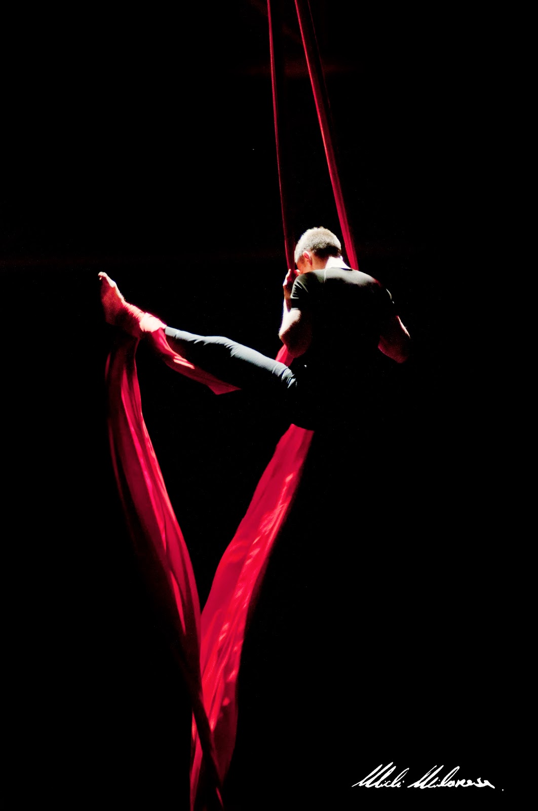 Parte la mia musica, libero il tessuto in mezzo alla pista e inizio a salire con la gente tutto intorno a me, ad un metro di distanza. Salendo incontro altri sguardi degli spettatori del secondo piano che sorseggiando bollicine mentre io mi appendo per un piede a testa in giù. Mi diverto un sacco, musica energica e clima caldo e partecipato fanno volare la coreografia tutta sorridendo. La bella sensazione finisce quasi troppo presto, ma per fortuna dopo un oretta ho un altra coreografia cosi posso assaporare la grazia di danzare in aria per ancora qualche minuto.